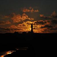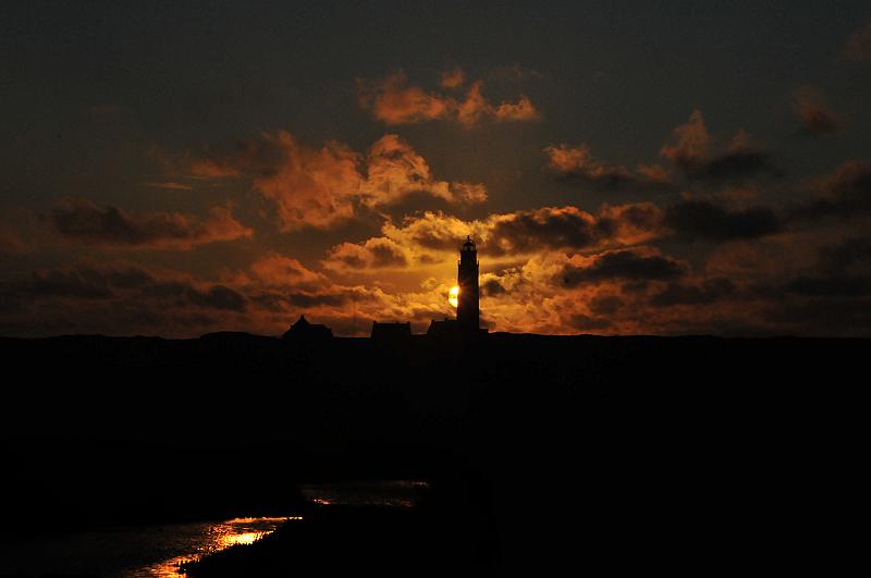 over de duinen de ondergaande zon gevolgd tot deze op het goede punt onder ging.