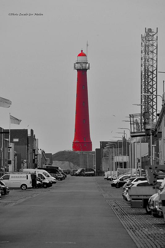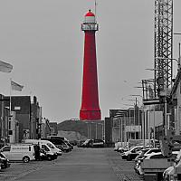 De vuurtoren van IJmuiden in zwart, wit en rood.