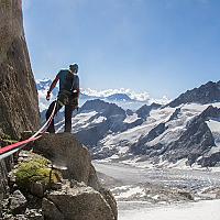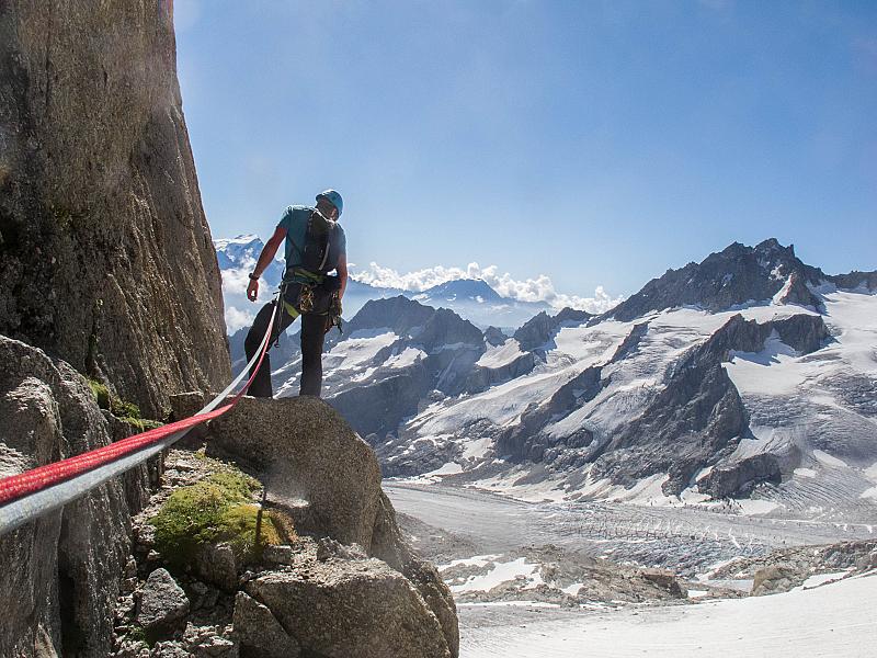 Jeroen Jeurissen zoekt de route tijdens een beklimming van de Aiguille de la Varappe. We zaten verkeerd en moesten een hele nare traverse afklimmen om weer op het juiste pad te komen.