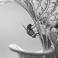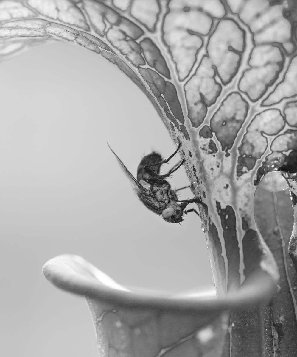 Een vlieg vlak voordat hij in de kelk van een vleesetende plant belandt... Zwart wit benadrukt de textuur van de plant en benadrukt de dreiging.