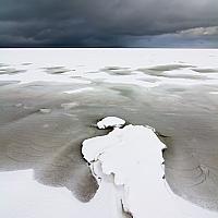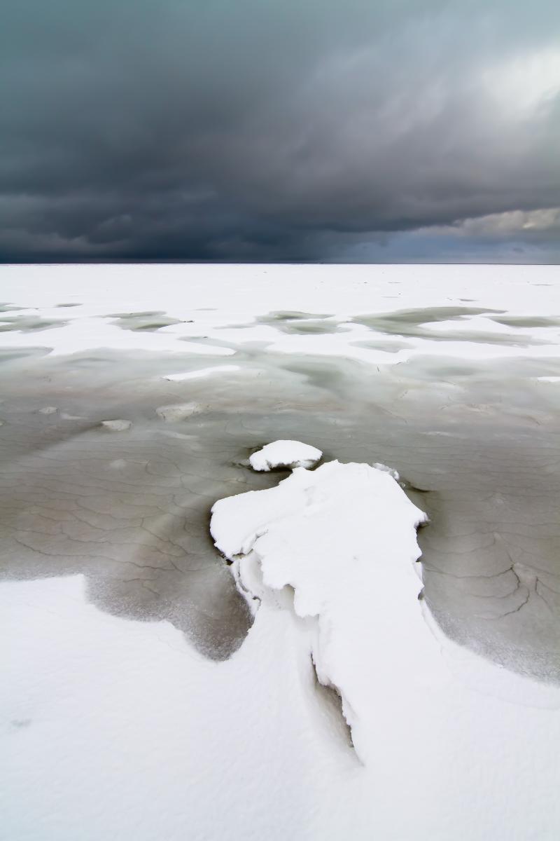 Een in mijn ogen on-Nederlands beeld van de Waddenzee, gefotografeerd tijdens een hele koude winter. Zo koud dat de zee voor een groot deel was dicht gevroren en besneeuwd. Op de achtergrond nadert een nieuwe zware sneeuwbui om een verse lading wit af te leveren.