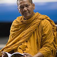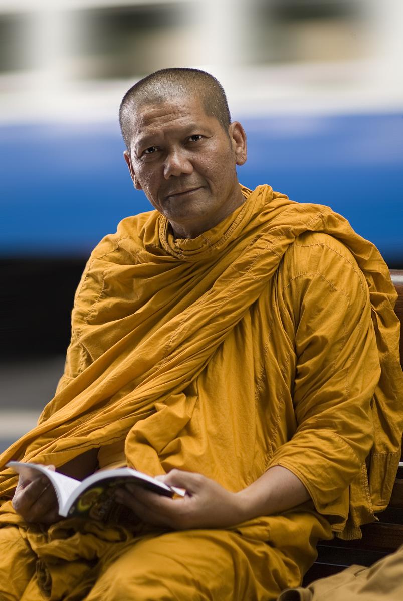 Deze vriendelijke monnik poseerde nieuwschierig op het treinstation van Bangkok