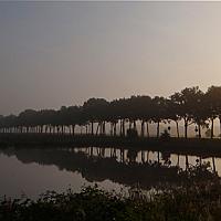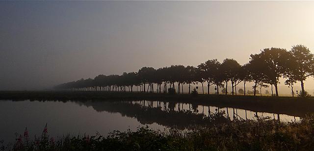 Zie hier een mooie lange bomenrij die verhult is in ochtendnevel.