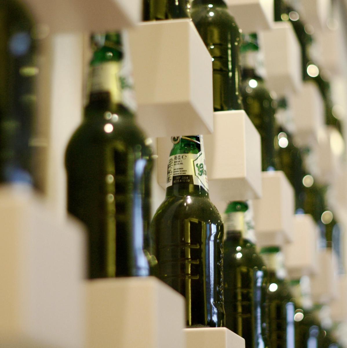 Decoratie van bierflesjes aan de wand in het proeflokaal van de Grolsch brouwerij.