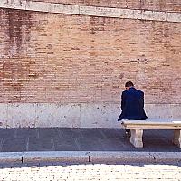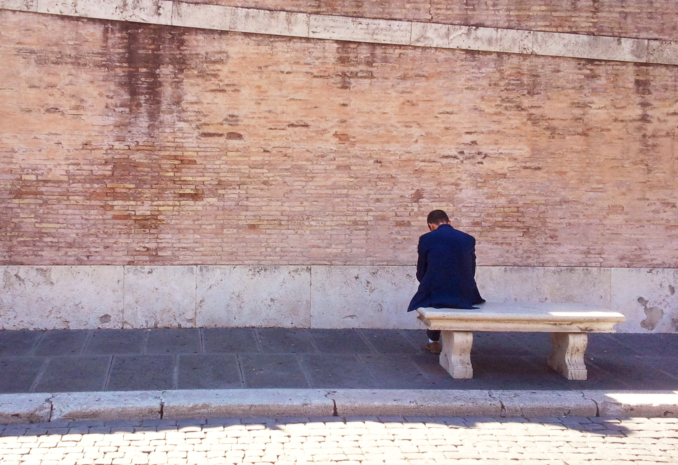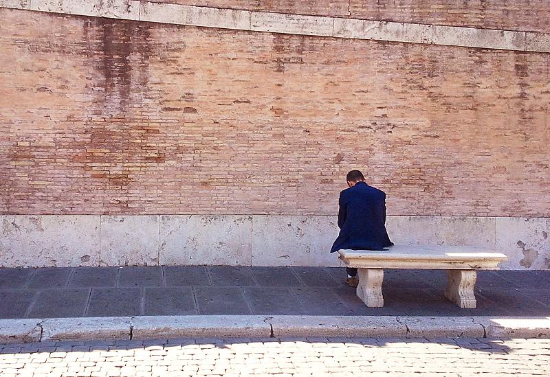 Deze man zat te lezen op een bankje op het Piazza del Popolo. De foto lijkt veel meer te suggereren.