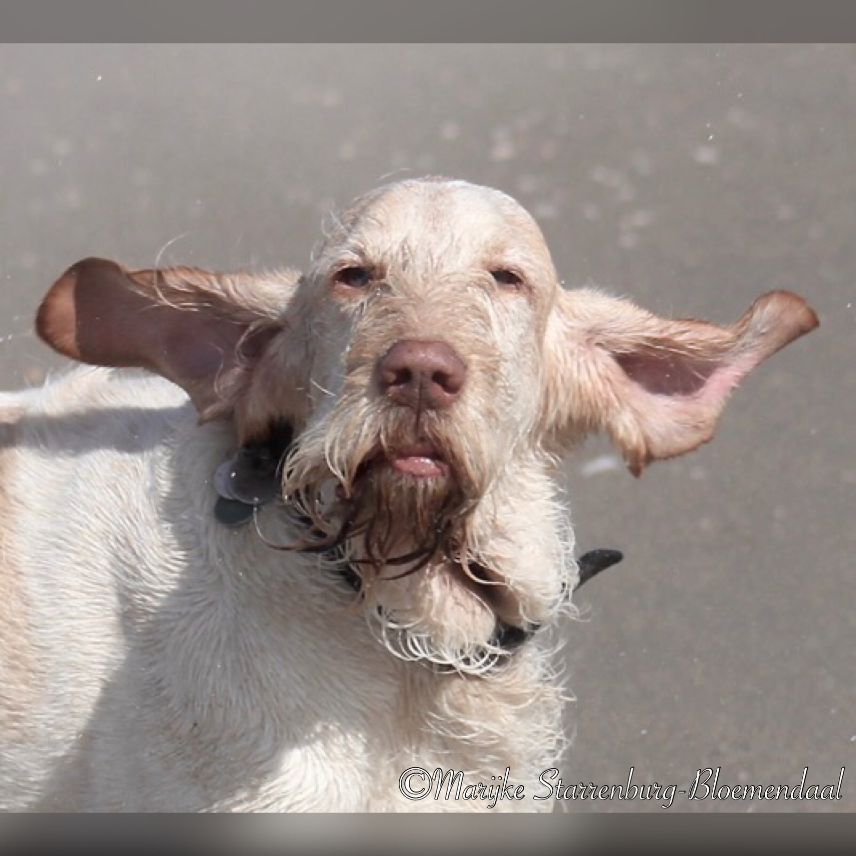 En bij een harde windvlaag staan de oren opzij van zijn kop.