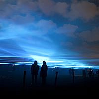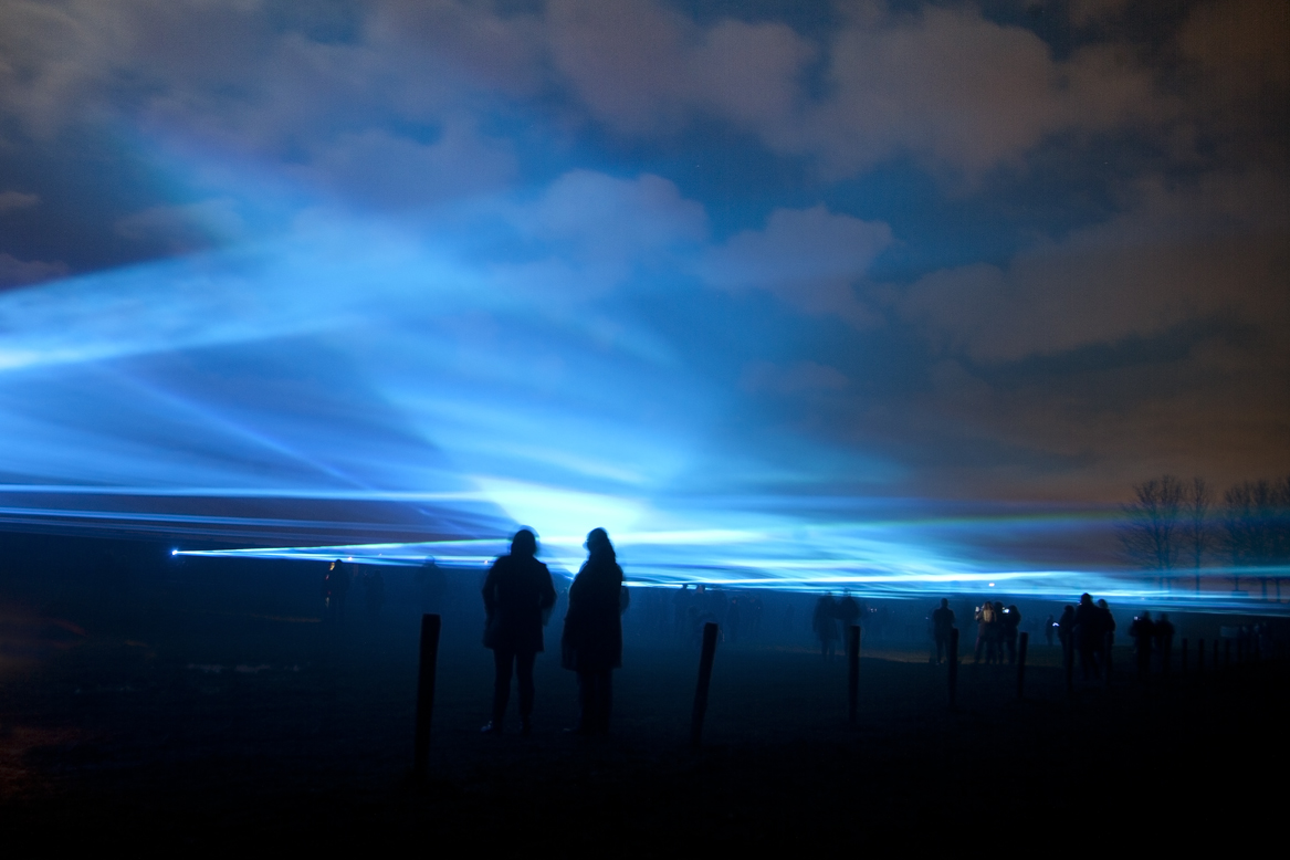 Het kunstwerk Waterlicht in Westervoort, 2015. Met lasers wordt de indruk gewekt dat je je onder de waterspiegel bevind, wanneer het water gestegen is. Foto genomen tijdens het blauwe uurtje.