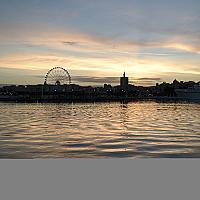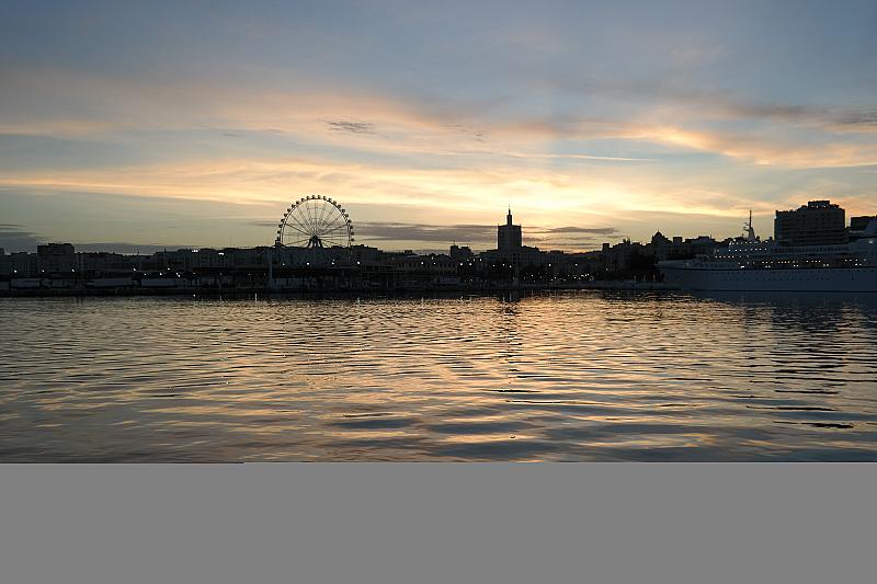 Op een warme avond in Malaga. in de haven was een mooie zonsondergang te zien achter de skyline van gebouwen.