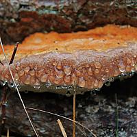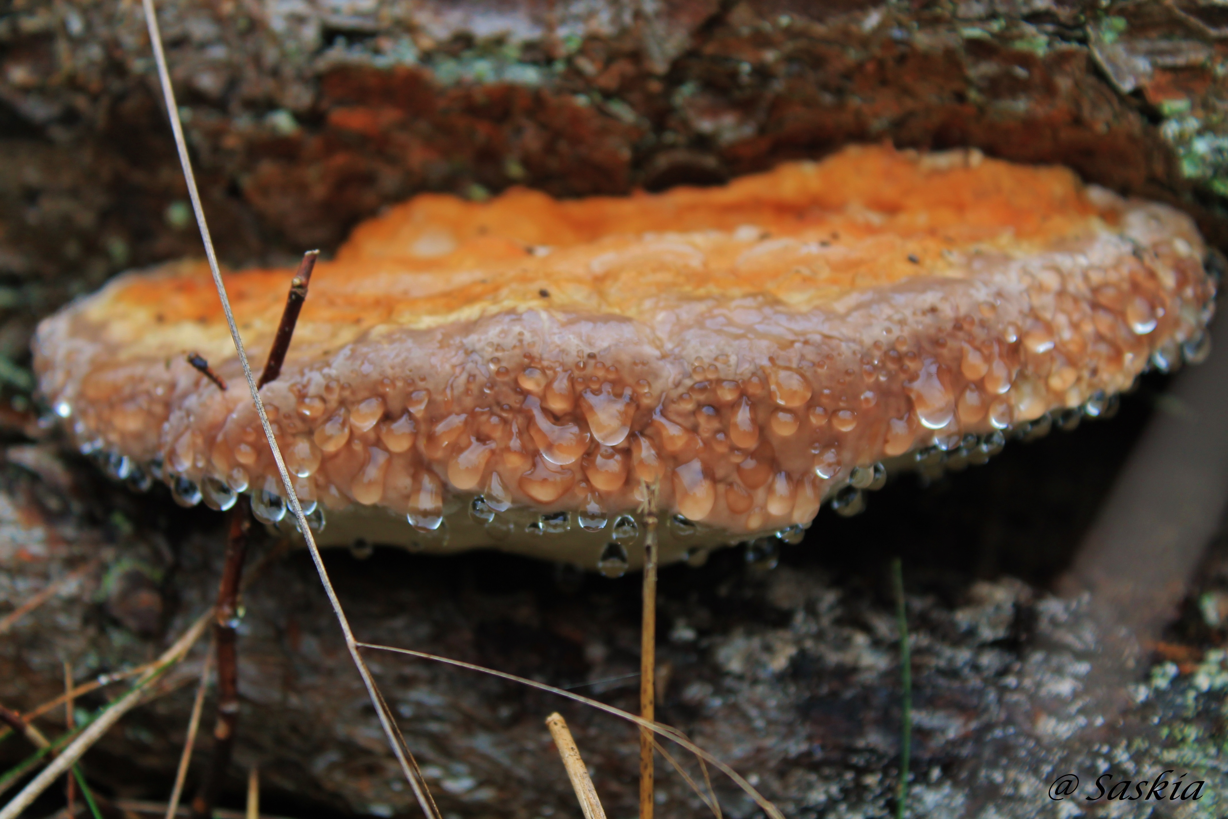 Door de dooi op de paddenstoel waterschone druppels te zien