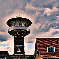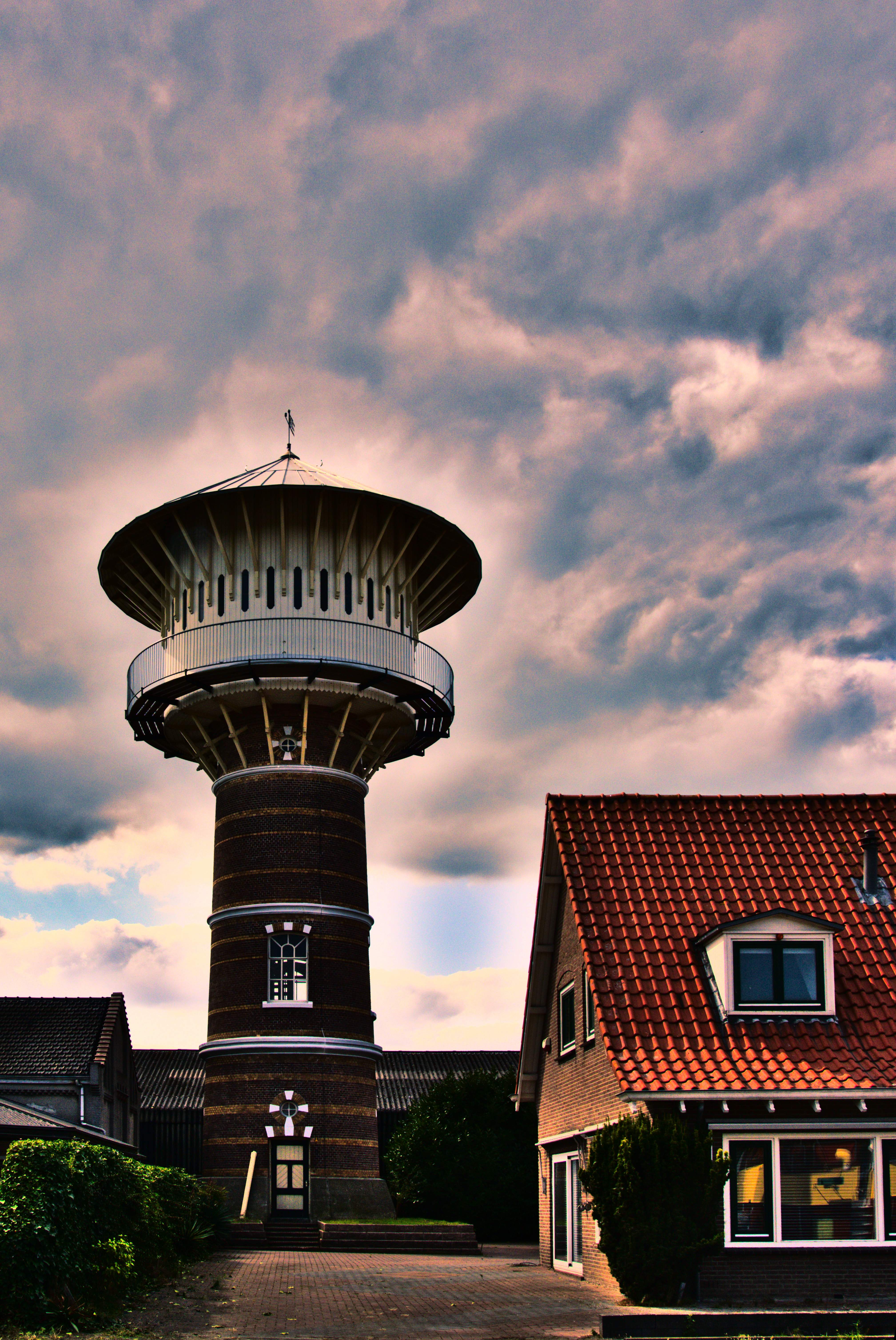 Watertoren tegen wolkenlucht.