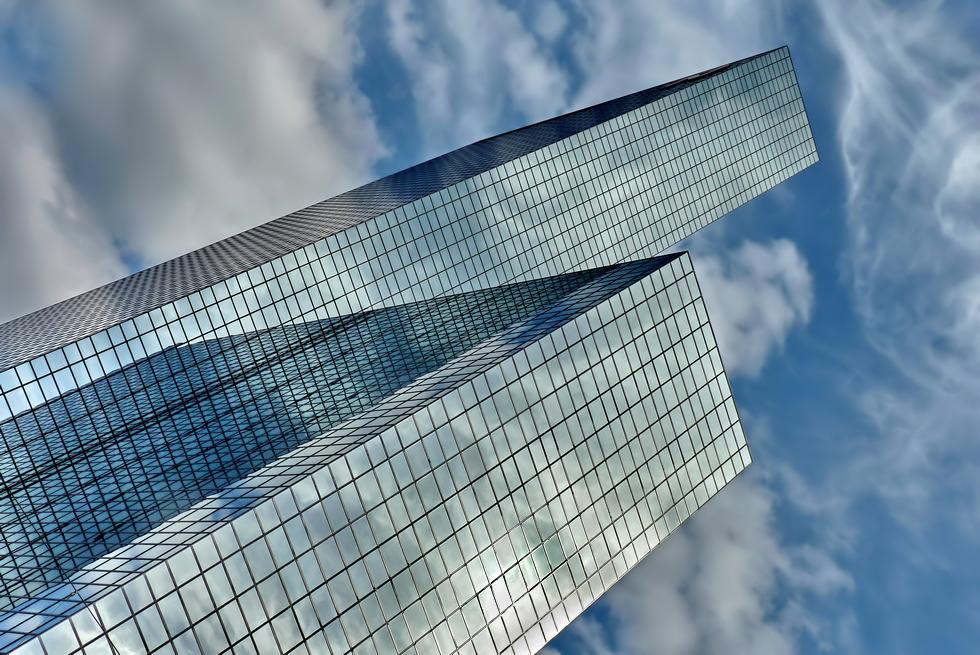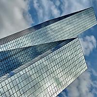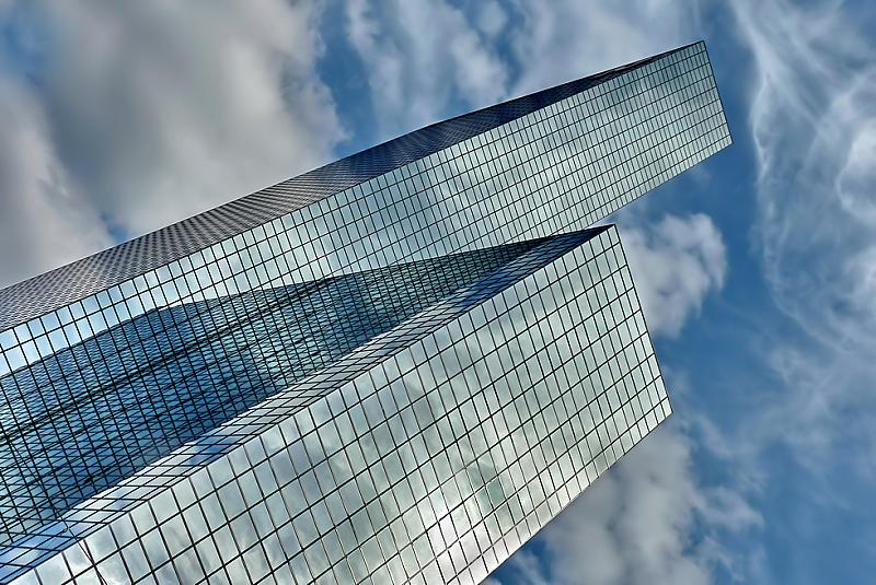 Een mooi hoog modern gebouw als bron voor een foto vanuit een bijzonder perspectief. De indrukwekkende lucht wordt weerspiegeld door het gebouw.