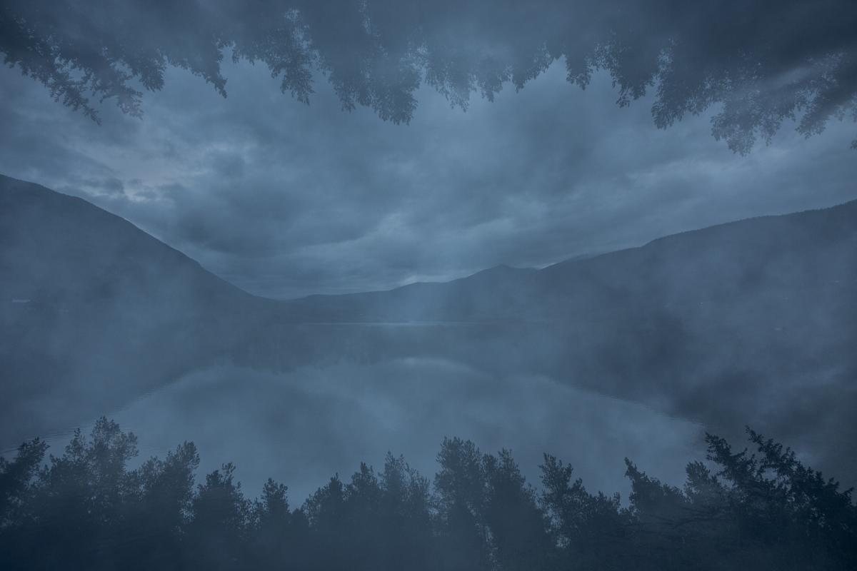Op het einde van een zonnige dag in Noorwegen werd het in de avond bewolkter. Ik keek uit op een fjord en besloot er enkele foto's van te maken. Ik was niet direct tevreden met het resultaat en besloot te experimenteren met meervoudige belichtingen. Omdat de naalden rondom mij prachtig bij het bergachtig landschap passen besloot ik deze bomen in mijn compositie mee te nemen. Ik wilde de bomen laten reflecteren net als de berg in het water van de fjord. Daarvoor maakte ik drie foto's die ik in elkaar liet zetten. Ik moest veel foto's maken totdat eindelijk alle drie de foto's goed op elkaar zaten.