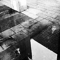 DIt is een weerspiegeling van een gebouw in een plas water.