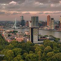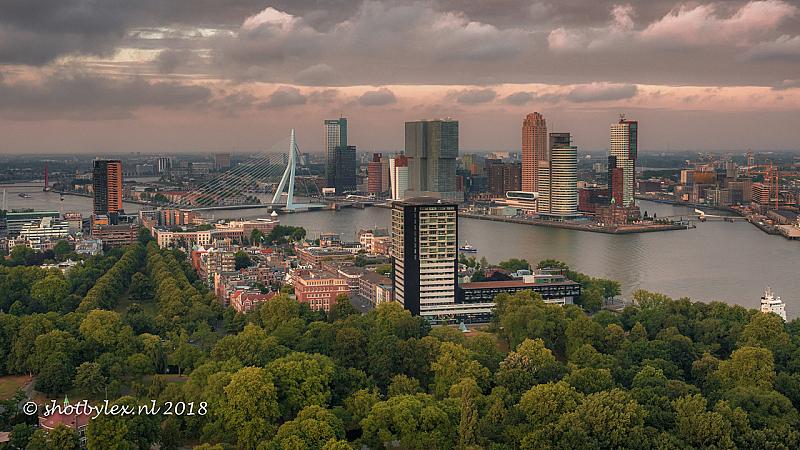 Skyline Rotterdam richting het oosten vanaf de euromast bij zonsondergang.