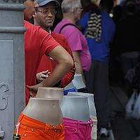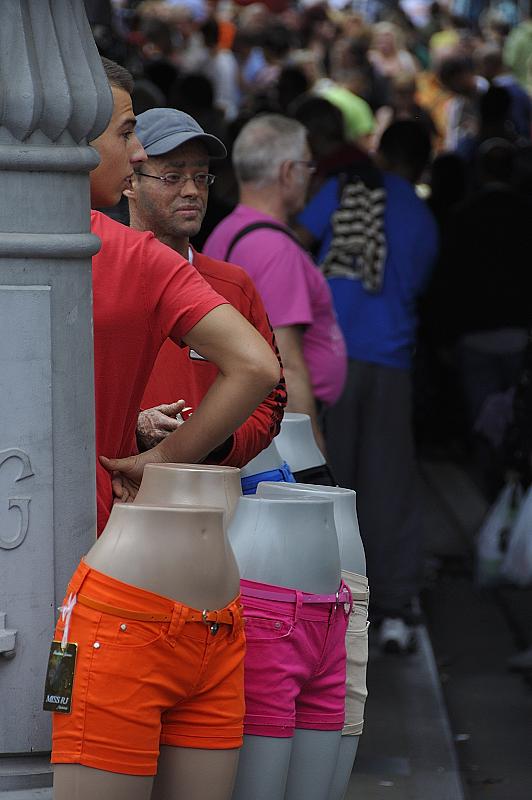 Genomen in Luik op de markt. Twee halve paspoppen met een oranje en roze broekje. Geheel onafhankelijk van de twee heren er achter, met een oranje en roze t-shirt...