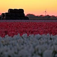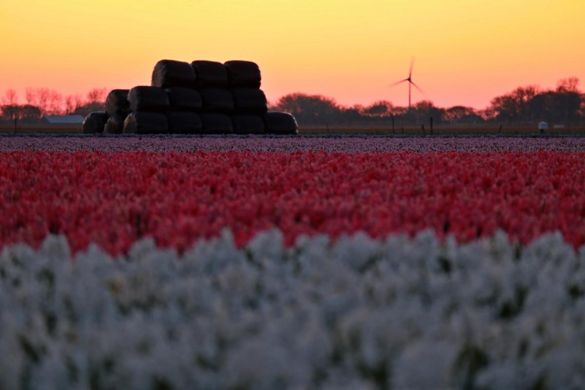 Windmolen met hyacinten op de voorgrond en de stroobalen tegen de vorst.