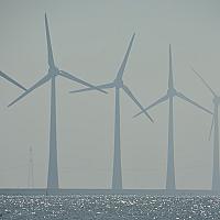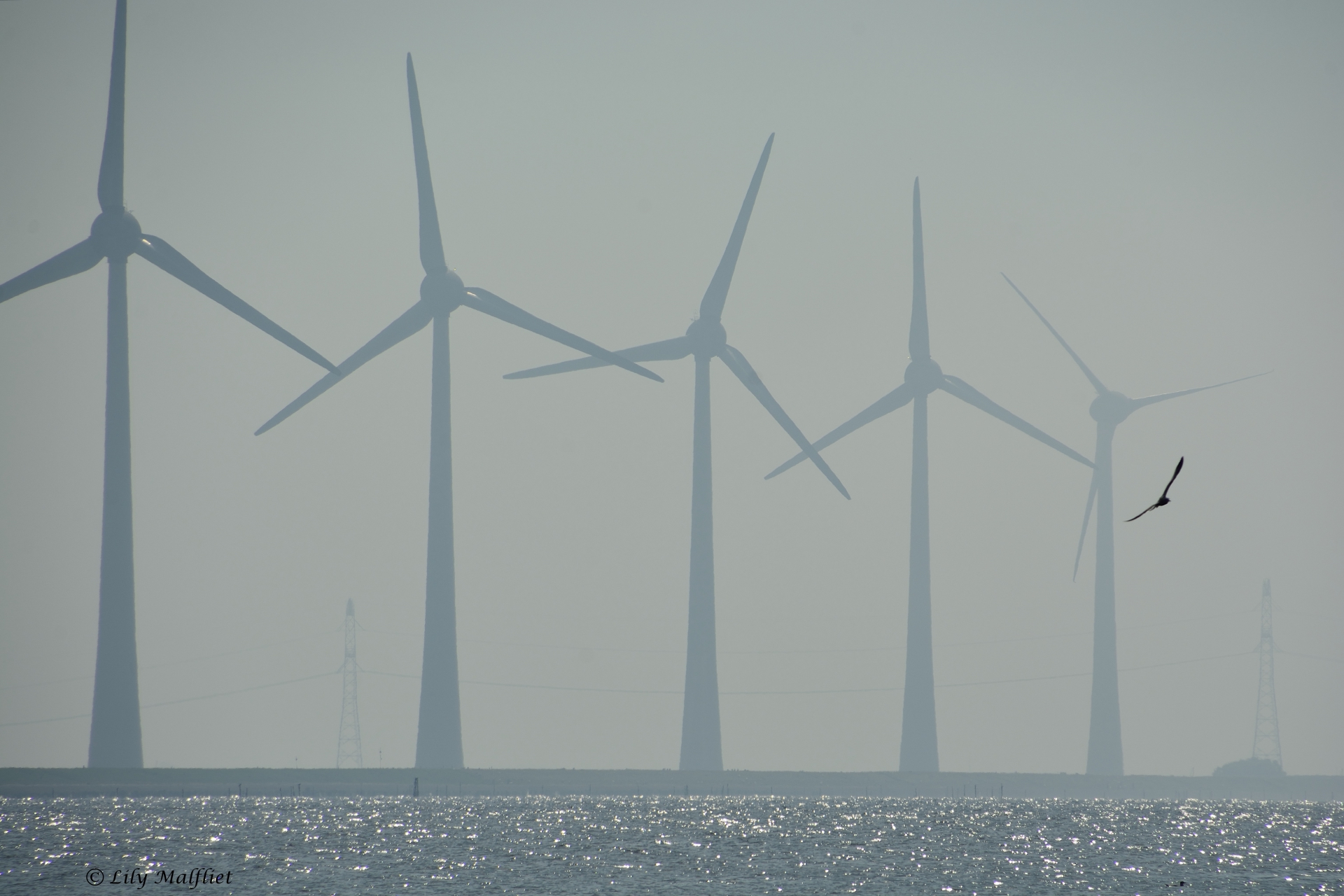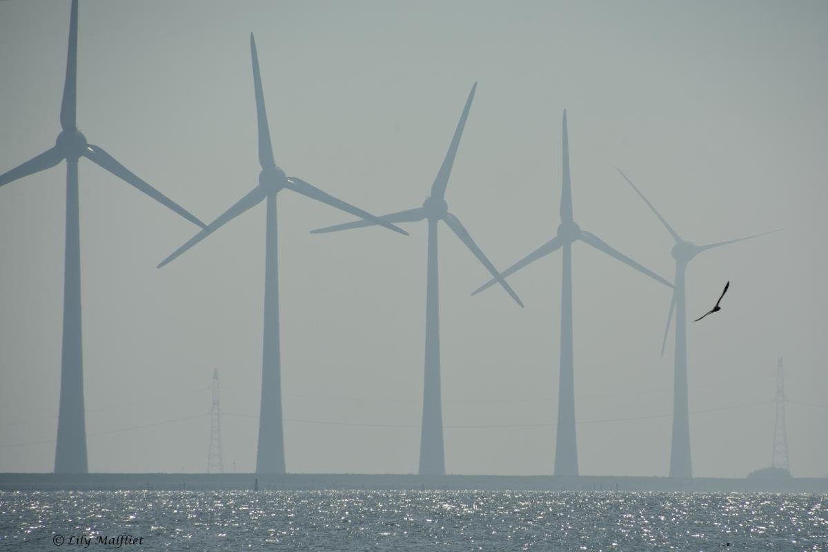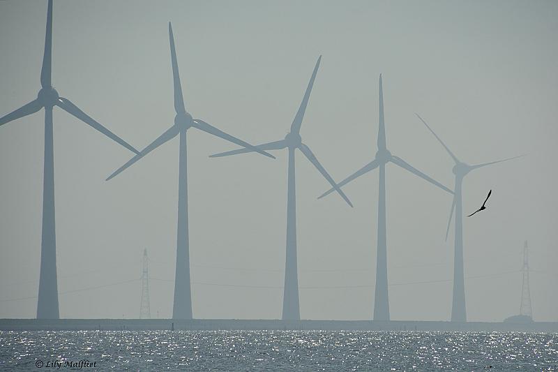 Doordat het toen een vochtige, zonnige dag was, komen de vijf windmolens prachtig wazig uit tegen de grijze lucht.