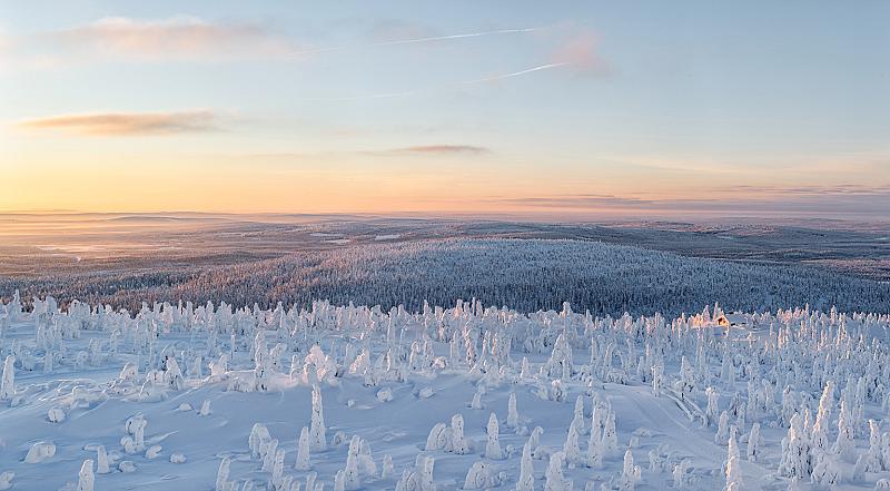 Een winterse foto gemaakt in Lapland met een temperatuur van min 30 graden. Het huis in de dal geeft juist de leegte aan in het uitgestrekte gebied waar alles bedekt is met sneeuw.