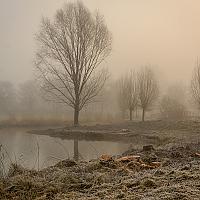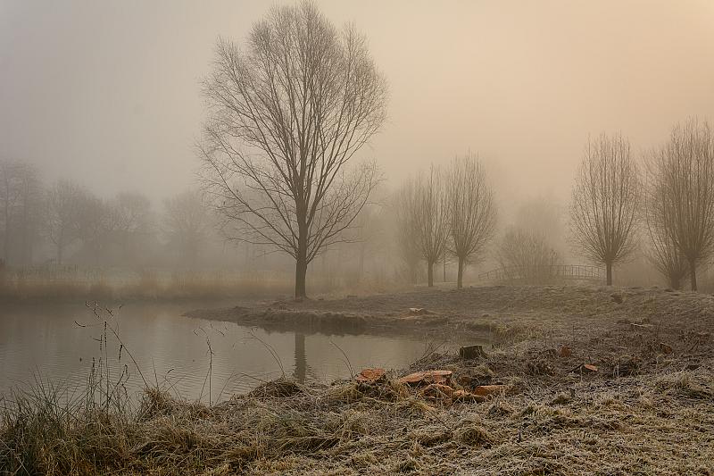 een december ochtenbeeld in mist in een klein park in Beuning, Gld