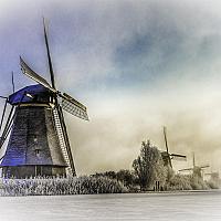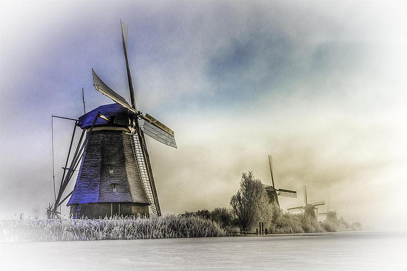 Foto van de molens van kinderdijk op zaterdag 4 februari waarbij het bijna min 20C was.