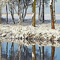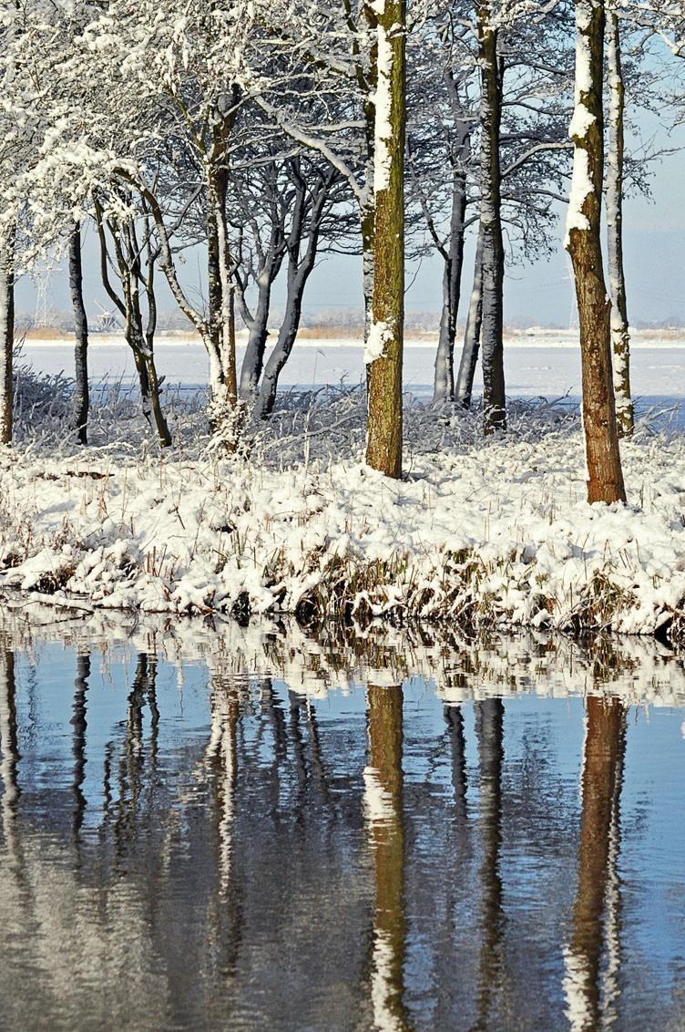 Een zondagochtend in februari, vers gevallen sneeuw, de zon die zijn licht liet schijnen en de bomen in het blauw van de lucht in het water reflecteert. In de nabewerking heb ik het contrast en het licht wat verhoogd.