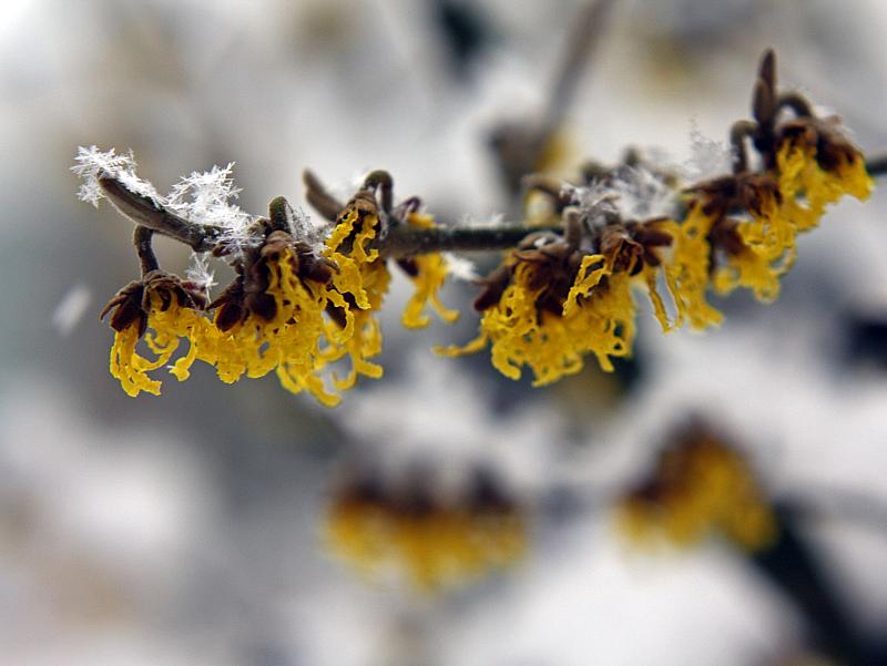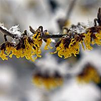 Door de zachte start van de winter kwam de bloesem al vroeg uit. Met de witte sneeuw geeft deze gele bloesem een mooi contrast. Echte winterbloesem in de sneeuw dus.