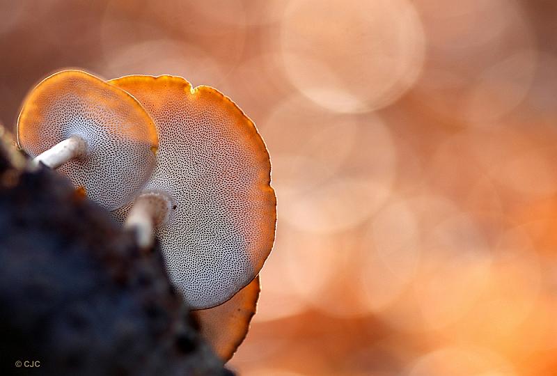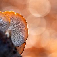een foto van een winterhoutzwam in het tegenlicht .