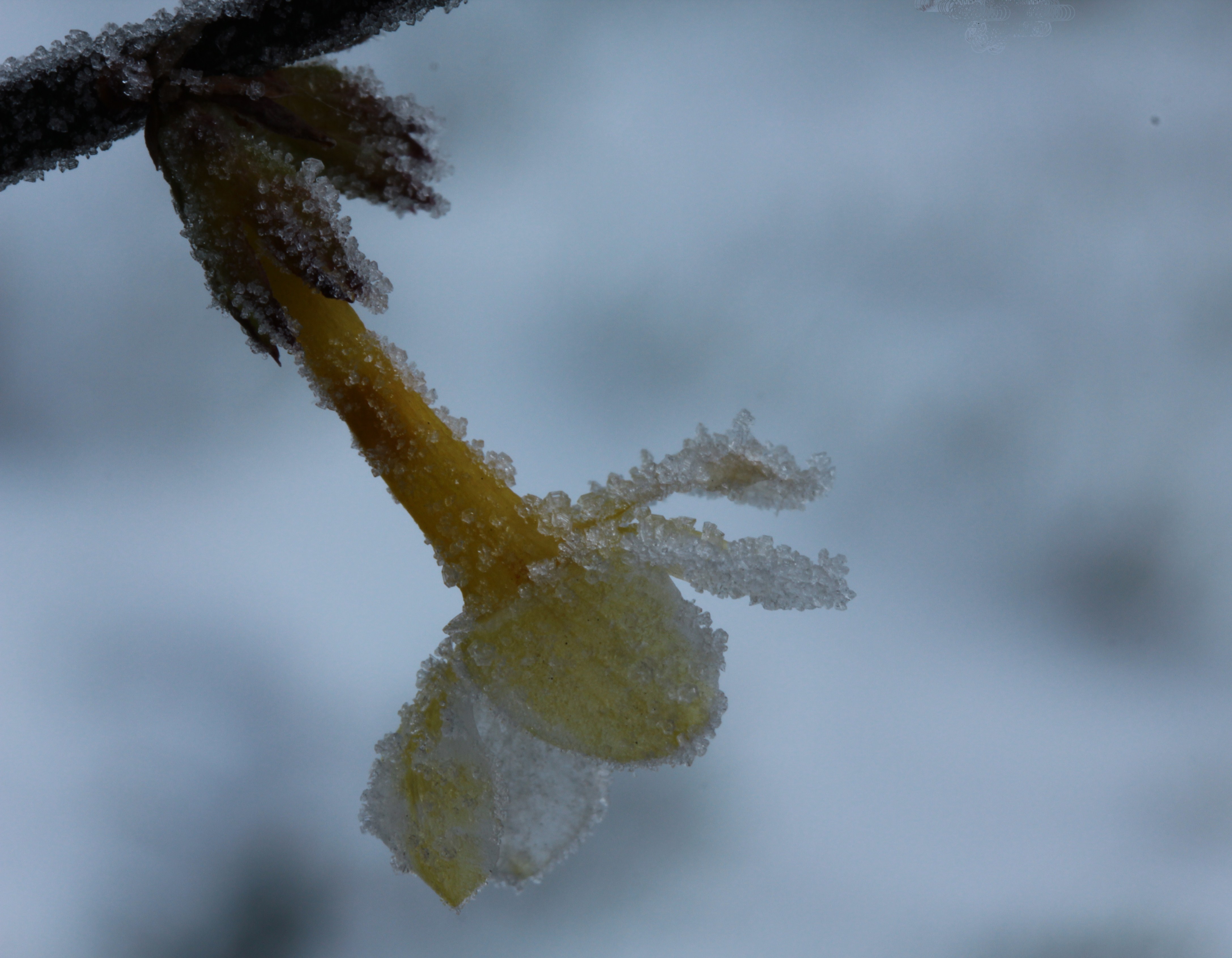 De koude winter is er dan toch eindelijk gekomen. De bloemetjes op de winterjasmijn lijken nu wel gesuikerde figuurtjes op een ijstaart. Prachtig!