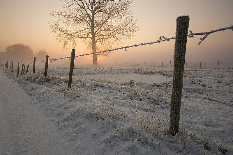 zonsopkomst en een winterlandschap.