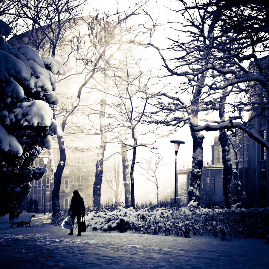Een koude dag, de winkels zijn dicht, knisperende sneeuw en het koude licht.
