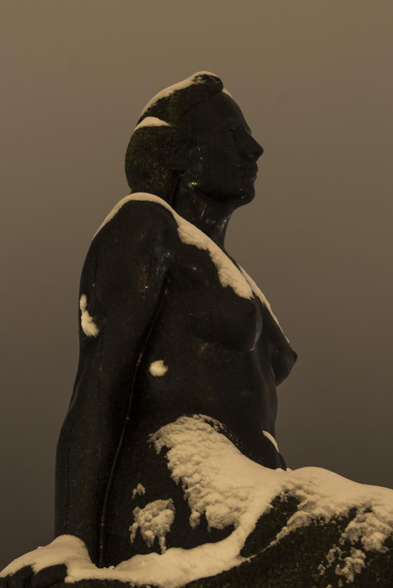 Categorie Wintersfeer: Op deze foto zie je een van de beelden die in het park in Oslo tussen het gemeentehuis en de haven staan. De tegenstrijdigheden van de blote besneeuwde vrouw komen in deze foto naar voren. Ik vind het in elk geval een mooie Wintersfeer.