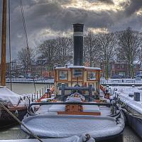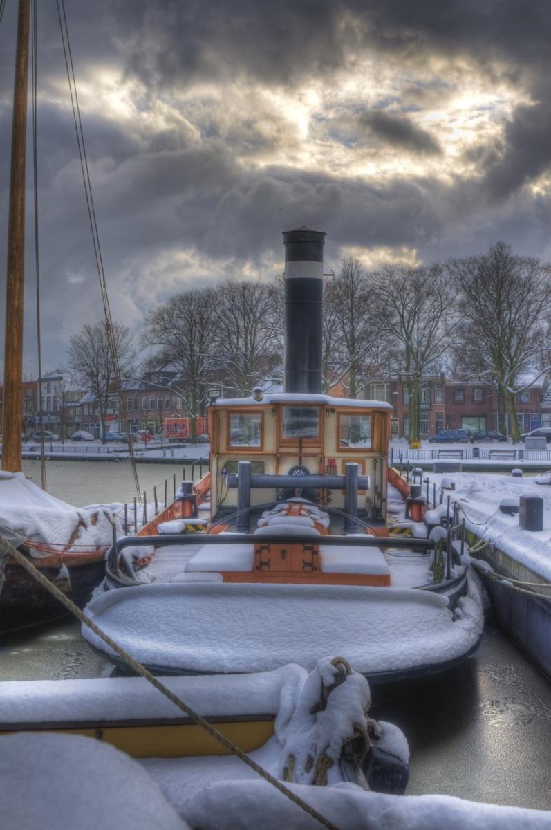 De sleepboot die de winter binnengesleepd heeft in Den Helder.