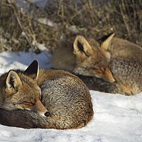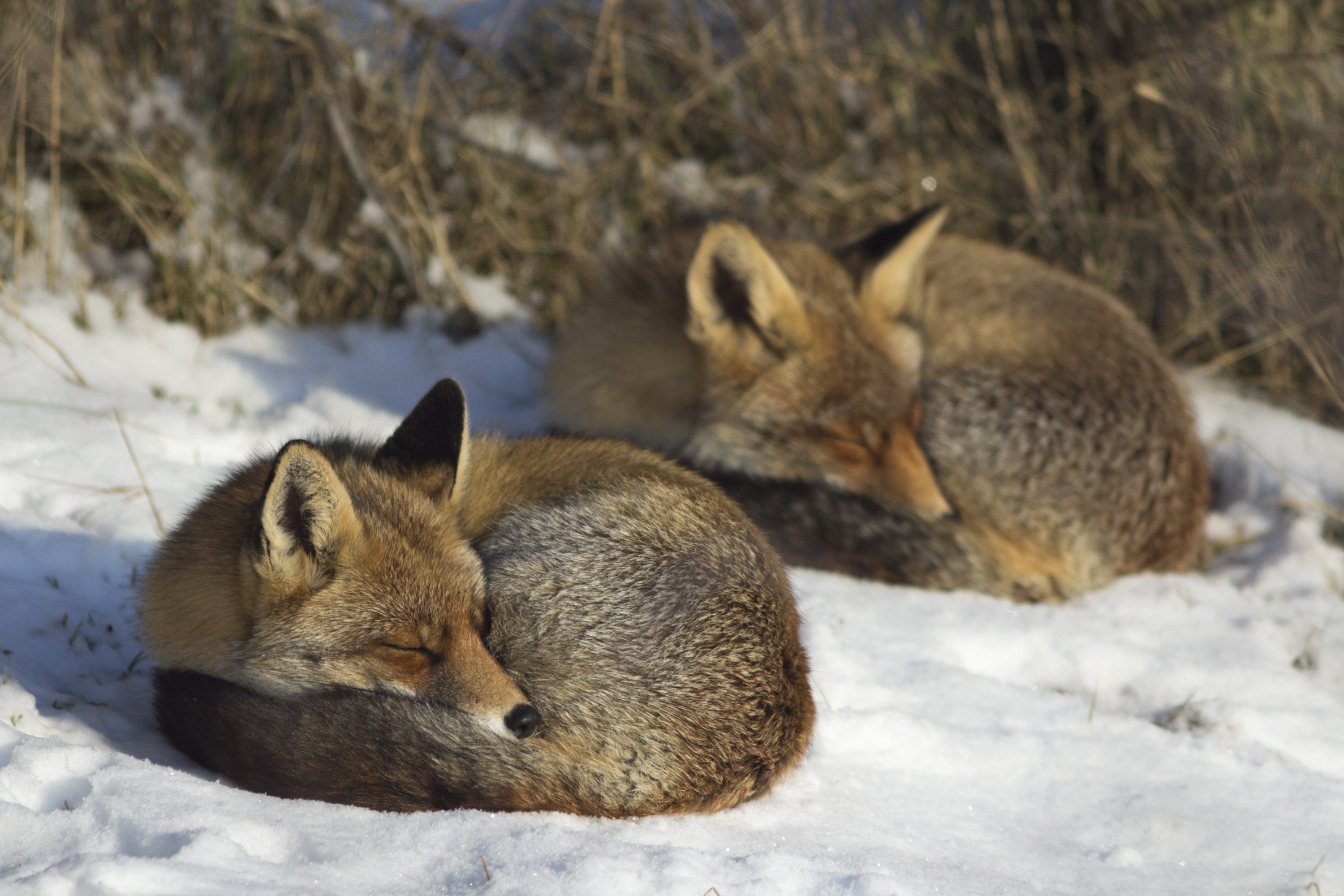 2 vosjes bergen hun hoofdje in hun mooie dikke wintervacht op en liggen te luieren in de sneeuw.