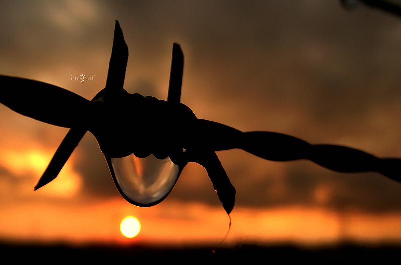 Na een flinke regenbui zag ik dit plaatje, die ene druppel, de zon die bijna onder was, een dampend weiland...