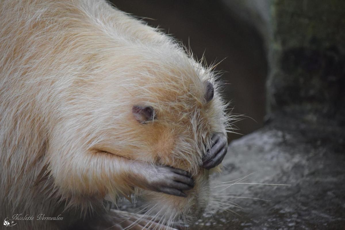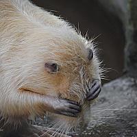 Een albino beverrat wast zich.