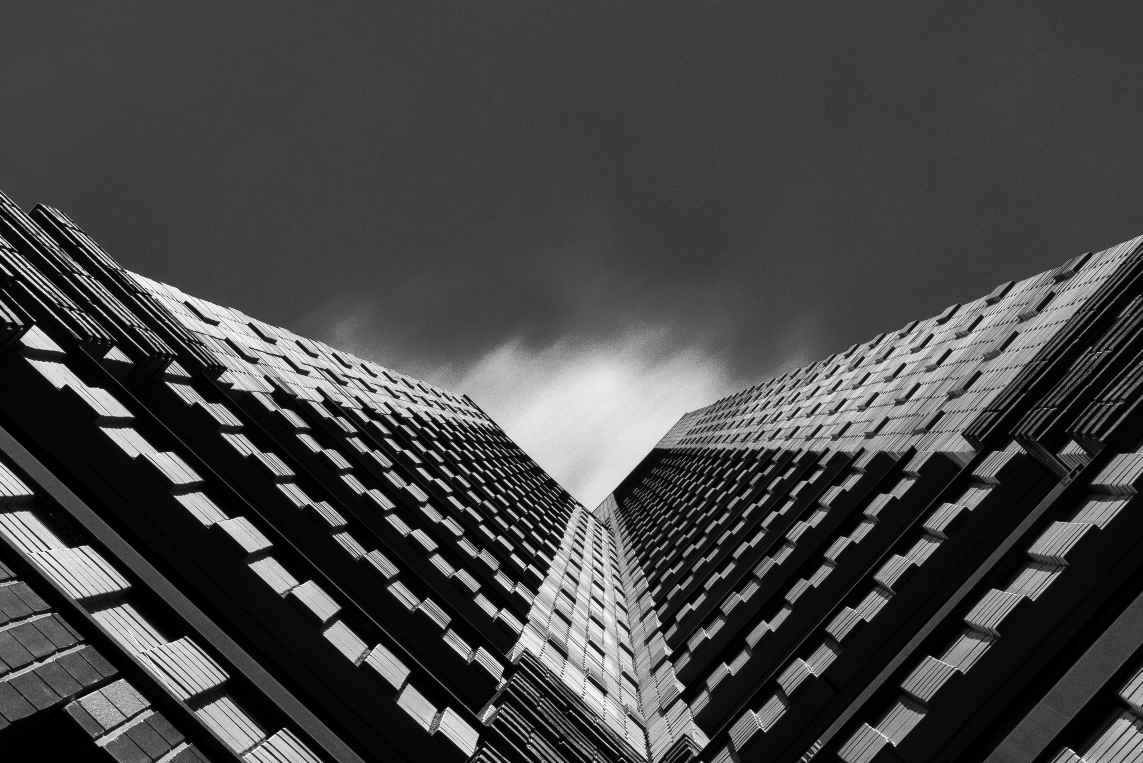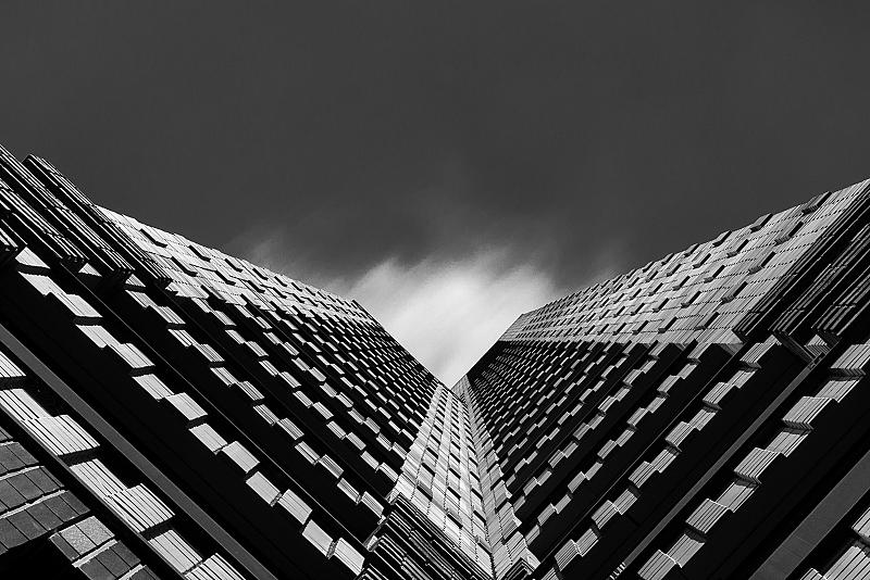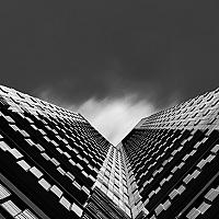 Foto genomen bij de Zuid-As van Amsterdam. Mijn opzet was om het gebouw te fotograferen met een passerende wolk die de leegte boven het gebouw zou opvullen. Na enige tijd gleed deze wolk mooi evenredig op zijn plek.