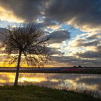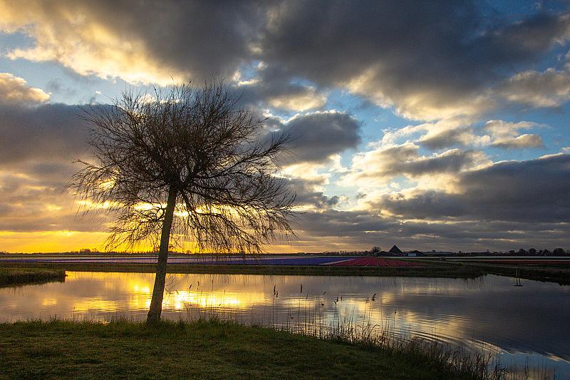 Ik ben vroeg op gestaan om de bloeiende bollenvelden op de foto te zetten als ik een eenzame boom zie staan tijdens de zonsopkomst. Op de achtergrond kun je nog bollenvelden zien.