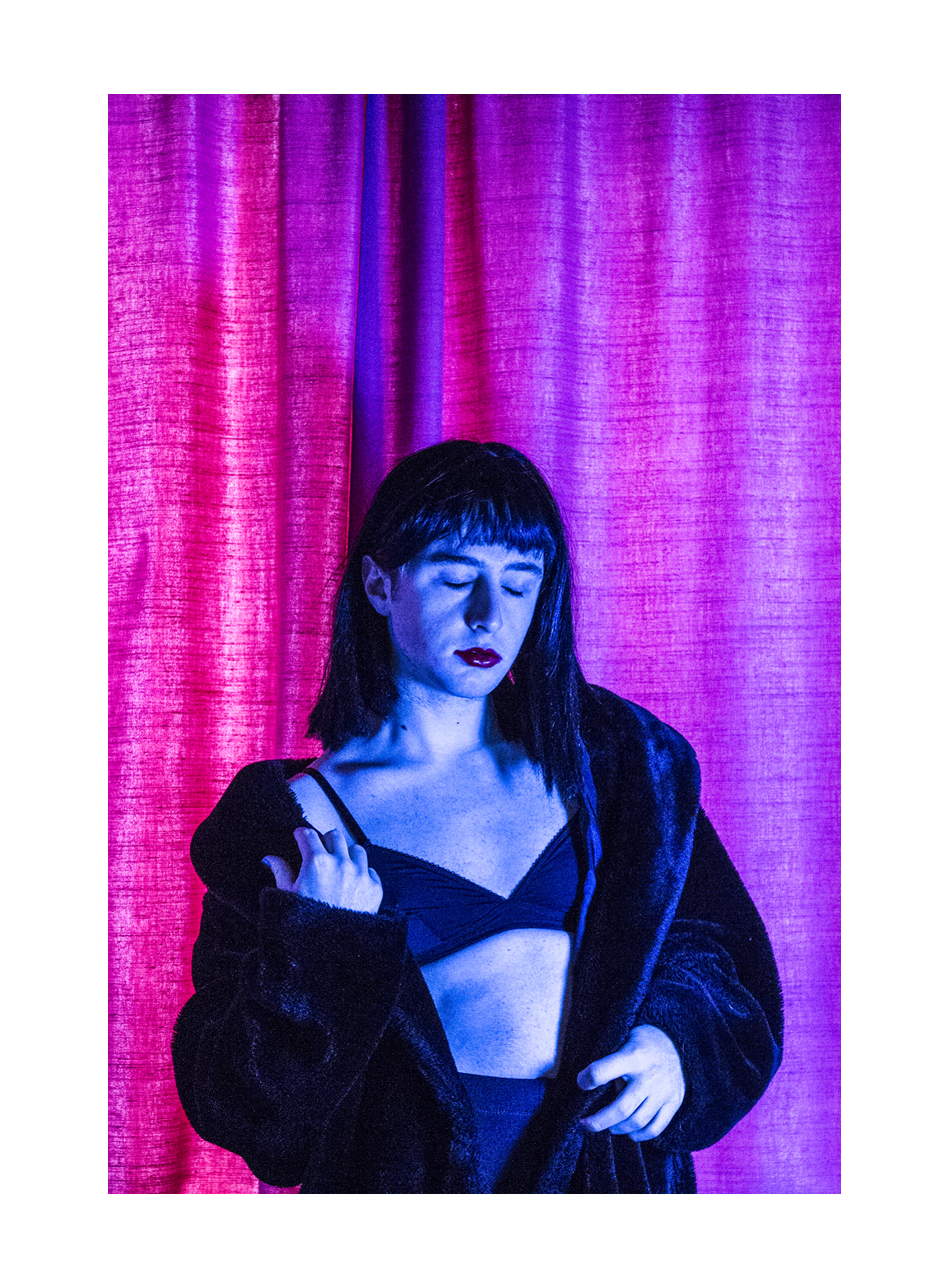 In mijn portrettenreeks ga ik de grens tussen man en vrouw aftasten. Waar begint en eindigt mijn mannelijkheid? Ben ik nog even mannelijk als ik met vrouwenkleren en make-up door de straat loop? We leren jongens om hun gevoelens te onderdrukken en als ze dit niet doen komen ze misschien wel vrouwelijk of gay over. Ik gebruik bewust deze termen omdat we al van jongs af aan deze termen met iets negatief associëren. We leren jongens om een "man" te zijn en deze zijn stoer en hard, niet gevoelig en soft. Dit is duidelijk geen juiste aanpak want hierdoor gaan jongens die niet aan deze genderrollen voldoen zich slecht voelen in hun vel.