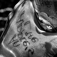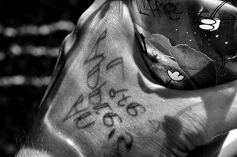 Glas ranja in de zon, de letters gaven een schaduw op mijn hand.