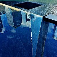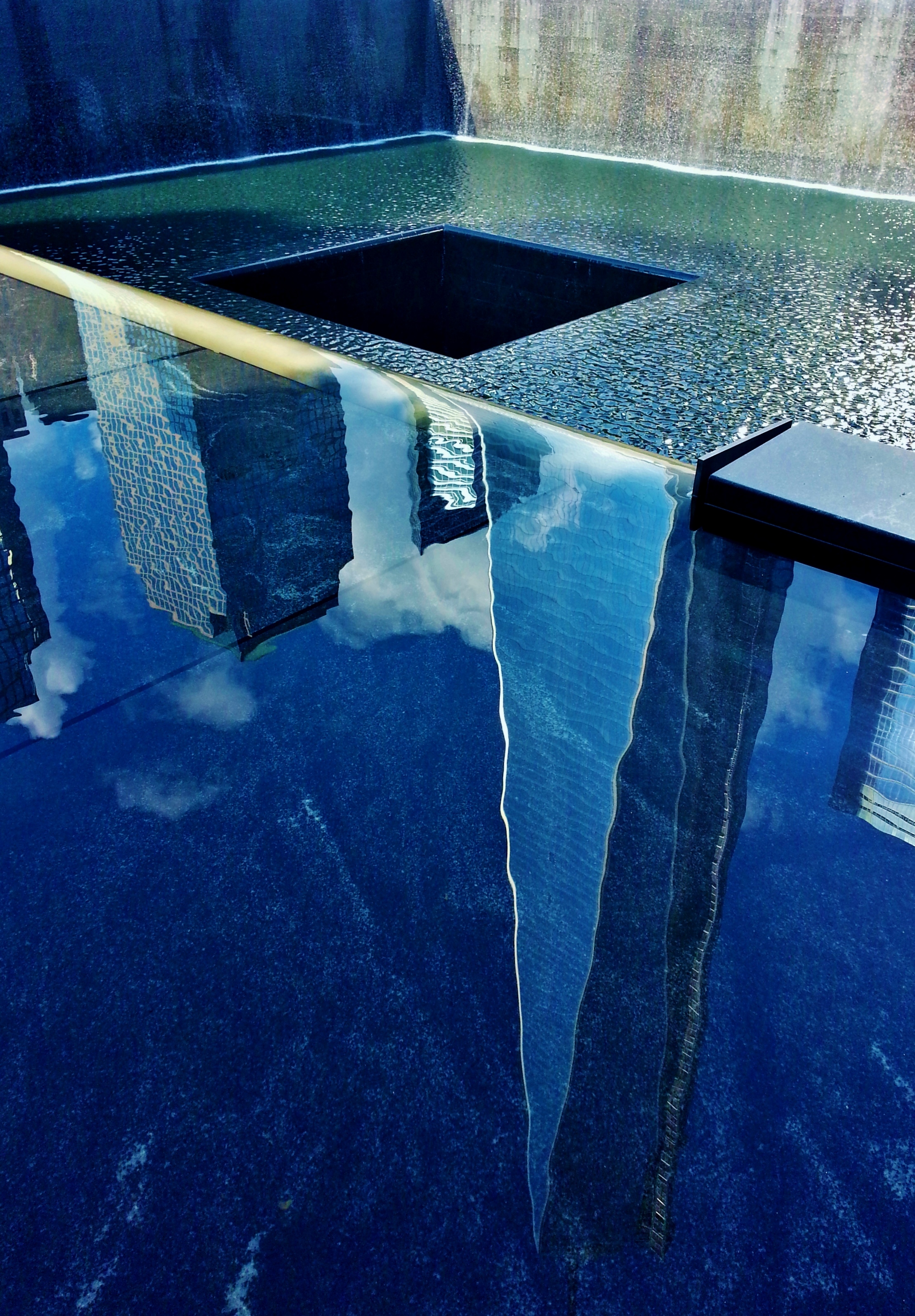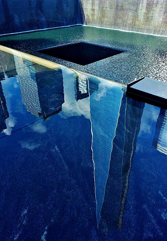 Reflectie van het nieuwe World Trade Center in New York in het water van het herdenkingsmonument waar het oude World Trade Center heeft gestaan.