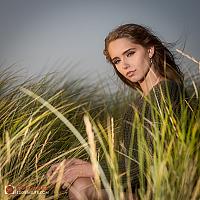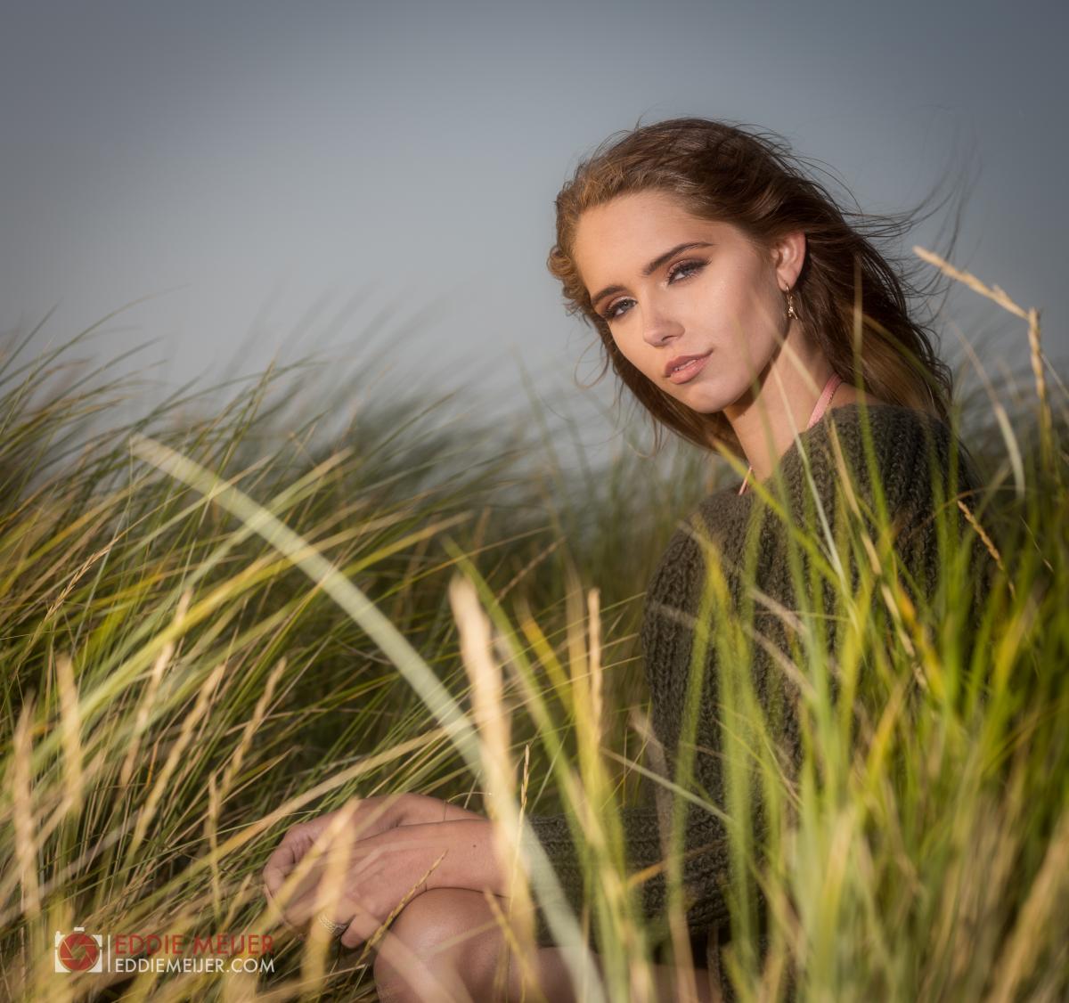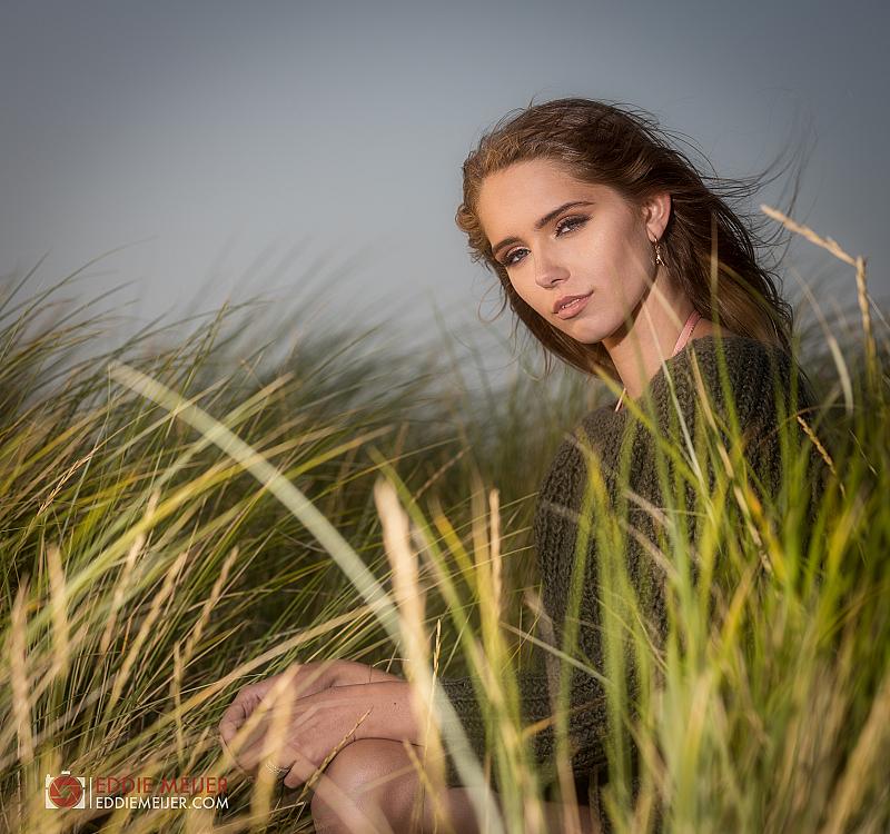 Yazzmine in de duinen bij Scheveningen, combi van natuurlijk licht en 1 externe flitser (Phottix Indra 500)