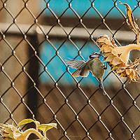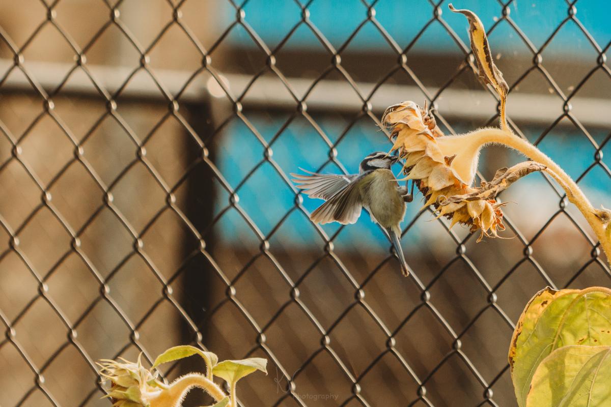 In de zomer stond onze tuin zo mooi in bloei met de zonnebloemen. Nu het weer minder zonnig wordt, is "de zon ook uit de bloemen". Eigenlijk zouden ze uit de tuin moeten, tot ik deze pracht koolmees er van zag genieten!