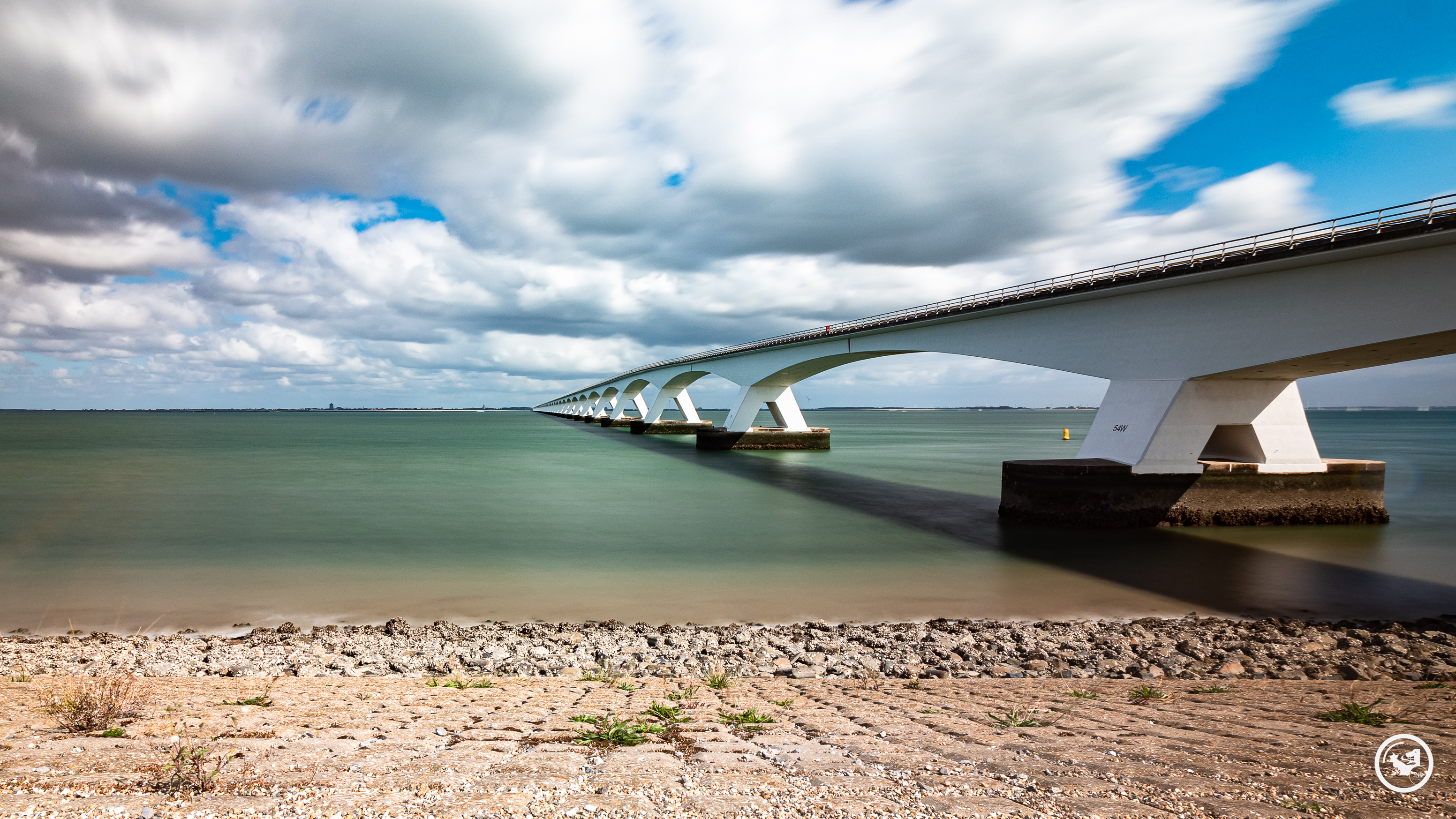 Voor deze foto heb ik gebruik gemaakt van een 8 stops grijsfilter. Dat een belichtingstijd van 30 seconde opleverde. Later heb ik in Lightroom de foto nog bewerkt (de kleuren iets opgehelderd). Op de desbetreffende dag dat deze foto is gemaakt, stond een stevig briesje en er waren genoeg wolken. Zo leverde de lange sluitertijd mooie uitgesmeerde wolken en een strakke Oosterschelde op. Het was ook mooi helder, zo zie je als je goed kijkt Zierikzee in de verte.