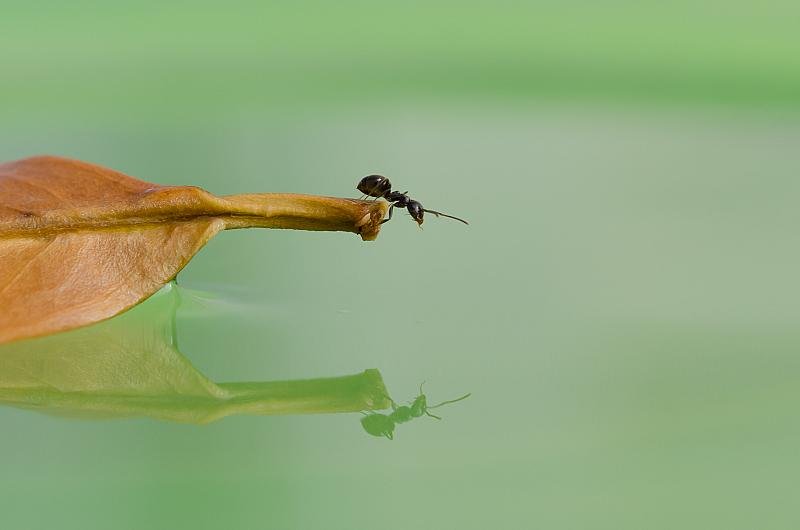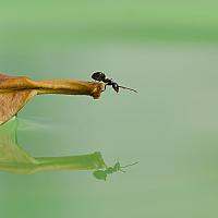 Deze mier liep op een blaadje en op het steeltje aangekomen keek hij naar beneden en zag zichzelf via het water. Mooi moment en ben blij met de opname.