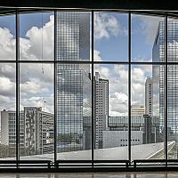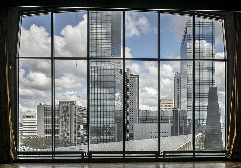 Genomen vanuit de filmzaal op het dak van het Groothandelsgebouw te Rotterdam. Zicht op Centraal station en Nationale Nederlanden