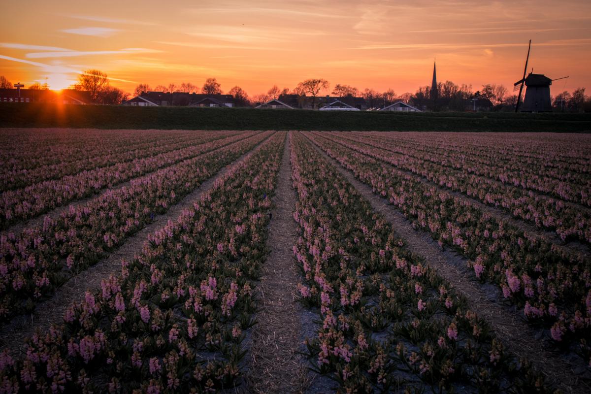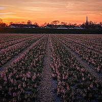 Hyacinten met op de achtergrond de skyline van oudorp. Op de rand van oudorp/Alkmaar. Canon M5 met canon EF-M 18-150mm