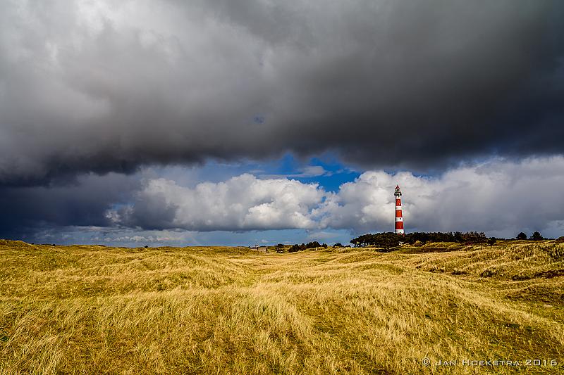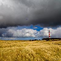 Weekje naar Ameland geweest met het gezin. Ik zag deze lucht en de grijze wolken raakten bijna de punt van de vuurtoren aan. Click! Vlak daarna barste de bui los....