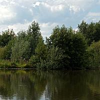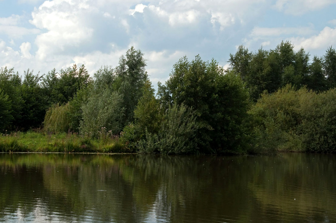 Water, blauwe lucht met witte wolken, reflectie en het groene groen van de zomer ....altijd weer mooi.