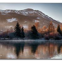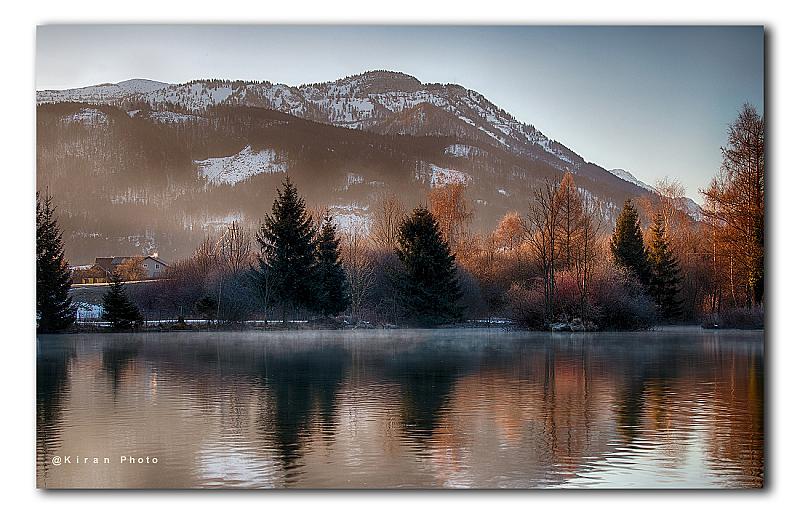 Het eerste zonlicht komt boven de bergtoppen en beschijnt de bomen.