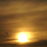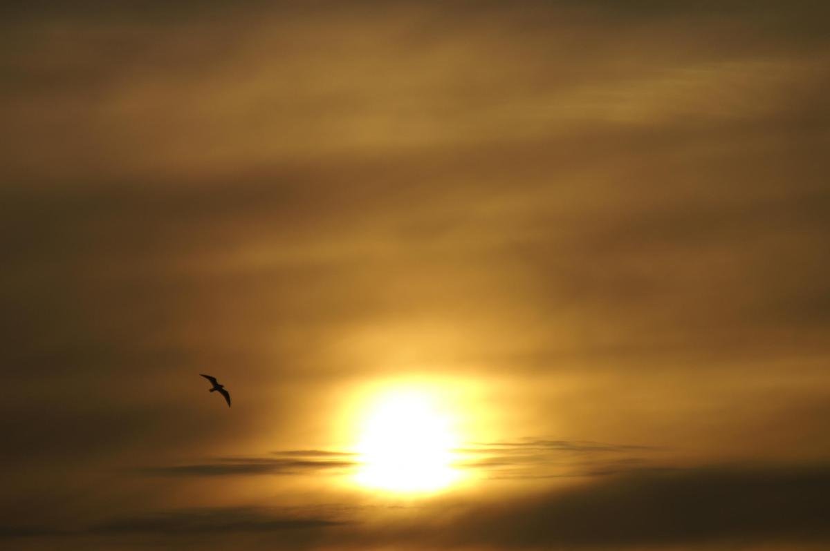Prachtige zonsondergang, net zo lang gewacht totdat er een meeuw voorbijkwam, klik, raak.